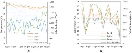 In Figure 4a, the trend of the measured average daily temperature of the gas flow and of the ambient have been reported together with the daily cumulated solar radiation. It can be highlighted that roughly ranges from 11.4–27.3 °C, which is clearly higher than the corresponding in winter (see Figure 4c) and slightly lower in summer (see Figure 4b). Furthermore, the trend of is quite similar to the cumulated daily solar radiation trend, especially in the summer regime.
