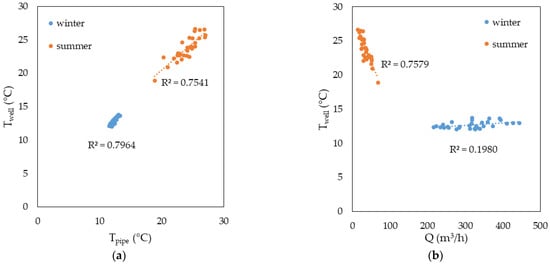 Correlation analysis of in winter and summer regimes with: (a) the average daily pipe temperature , (b) the average daily flow rate , (c) the average ambient temperature , (d) the daily cumulated solar radiation .