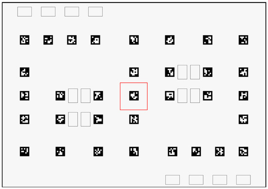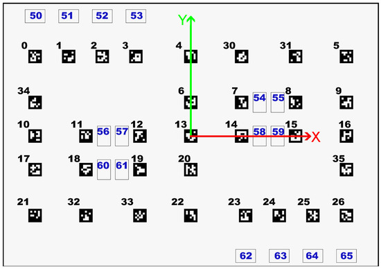 In this context, several approaches have been developed over time, using sensor data and several algorithms. The use of artificial intelligence (AI), especially machine learning (ML), is becoming a common approach to this problem [3]. Furthermore, there are many robot competitions where localization is a fundamental principle. One example of this type of competition is RobotAtFactory 4.0 (https://www.festivalnacionalrobotica.pt/2023/robotfactory-4-0/, accessed on 10 December 2022), where the AMR has to move boxes from one place to another in the shortest possible time, without external communication. In this case, the AMR can use whichever means is necessary to locate itself as long as it complies with the rules, and one possibility is to use markers placed in the environment (ArUco markers). Figure 1 shows a top view of the field. The reference frame is located at the center of the field, where the green arrow indicates the y axis, the red arrow indicates the x axis and the numbers indicate the IDs of each ArUco marker. The black numbers indicate the tag’s ID on the floor, while the blue numbers indicate the tag’s ID on the walls.