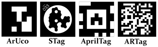 Fiducial marker (Sources to generate: ArUco: https://chev.me/arucogen/, STag: https://github.com/bbenligiray/stag, AprilTag: https://github.com/AprilRobotics/apriltag and ARTag: https://shawnlehner.github.io/ARMaker/, accessed on 15 January 2023) comparison between ArUco Stag, AprilTag, and ARTag [35].