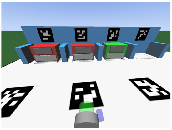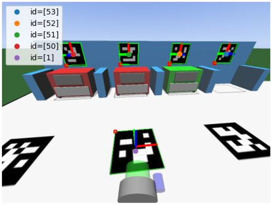 Fiducial markers in their general form are objects used to provide a point of reference or a measurement in an image [21]. There are several types of fiducial makers, such as ARTag, AprilTag, ArUco, and STag [21]. These approaches are different from each other, such as the way in which each of them is built. Figure 2 presents a comparison between these four types of fiducial markers. For further information and a comprehensive discussion of specific features, the reader is referred to [35]. One of the most common types is the binary square fiducial marker. An example of this type is ArUco, which is present in the OpenCV library (https://docs.opencv.org/4.x/d5/dae/tutorial_aruco_detection.html, accessed on 30 November 2022) and was developed by [36]. In this work, the ArUco will be used because this is the type used in the RobotAtFactory 4.0 competition.