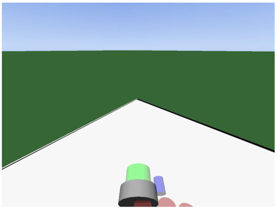 To collect the data, two adjustments had to be made in the scenario to avoid problems that were not relevant to validating the ideas proposed here. First, the illumination was replaced to try to avoid dark parts on the field, and, second, the color of the walls was changed to white (because the library used to identify them works better when the edges are white). Figure 6 presents an example of an image from the simulator. Each image is associated with a global pose {x, y, θ} (where x and y are in meters and is the orientation in degrees). For example, the image in Figure 6 corresponds to the pose .