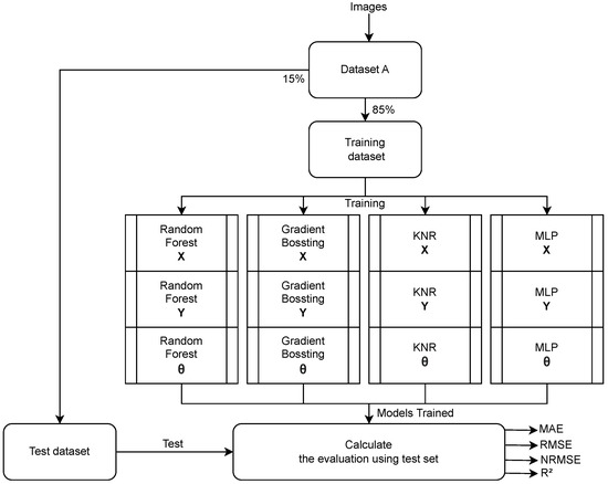 Three independent models were created, one for each variable (x, y and ). Four algorithms were used: Random Forest Regression, KNR, MLP, and Gradient Boosting. The library used to implement these models was scikit-learn (https://scikit-learn.org/stable/, accessed on 19 December 2022), and the models were RandomForestRegressor, MLPRegressor, KNeighborsRegressor, and GradientBoostingRegressor. The first process to be executed was training each one of these algorithms using dataset A. To do this, the dataset was separated into two parts: 85% to train and 15% to validate. After the training, using the error measurements, which will be explained in Section 3.4.4, the models were evaluated. Figure 10 presents the described process. The model parameters used are the default parameters defined in Scikit-learn.