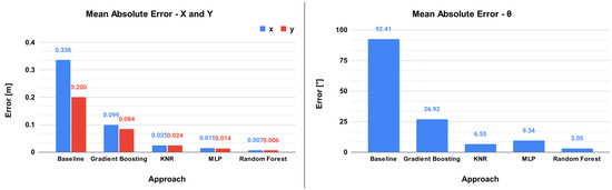 To better illustrate the results, Figure 11 shows a graphical comparison between the approaches. The left graph presents the MAE error for axes x and y in meters, while the right graph presents the MAE error for the , in degrees.