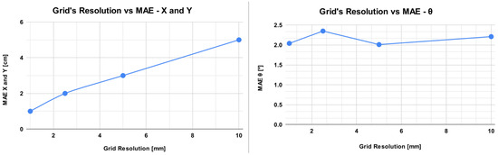 Figure 12 presents a graphical depiction of the behavior of the MAE for the decreases in the grid’s resolution. The MAE for the x and y axes is the same and is in centimeters, presented by the left curve on the graphic. The MAE for is in degrees, shown by the curve on the right.