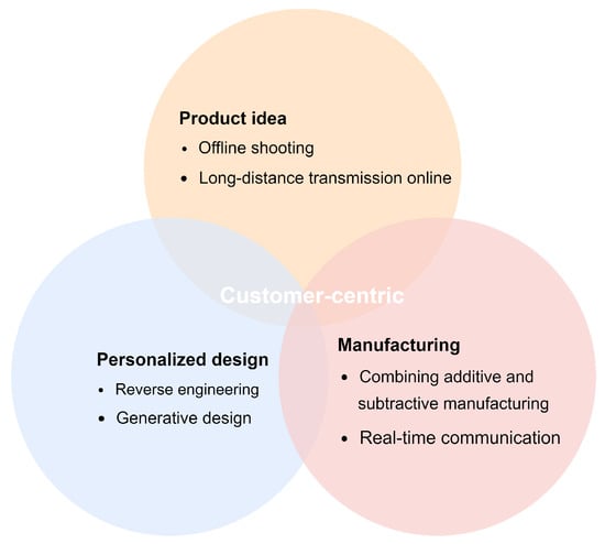 Personalized customization is a customer-centric product manufacturing process. Introducing deep learning methods in the reverse engineering stage can reduce costs, shorten design time, and provide customers with long-distance transmission services. The generative design provides designers with more model styles, as well as topology-optimized structures. In the product production stage, additive manufacturing and material manufacturing can be combined. Manufacturers must interact and communicate with customers in real time to ensure product visibility and build connections and trust between customers and manufacturers. The customer-centric customized production model of on-demand manufacturing is shown in Figure 2.