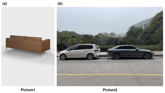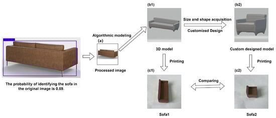 A picture from a webpage [43] is downloaded with a resolution of and is named Picture1. A photo with a resolution of is taken by iphone12 in the real world and is named Picture2. Other information of the pictures are shown in Table 2. Picture1 is a four-seater sofa, as shown in Figure 3a, and Picture2 contains two cars of different shapes, as shown in Figure 3b. After detection and identification by the YOLOv4 network, a small sofa is extracted from Picture1. A new 819 pixel × 819 pixel size sofa picture is generated, as shown in Figure 4a. The picture is input into the YOLOv4 network for detection and recognition. The outputs of YOLOv4 are shown in Table 3. The probability of being identified as a sofa in the original image is 59%. The generated new picture is used as the input of the DVR network to construct the 3D model of the modified sofa, and the produced 3D model is shown in Figure 4(b1). Designers get the size and shape of the sofa, as well as personalized custom design. As shown in Figure 4(b2), a four-seater sofa can be turned into a single sofa. This one-seater sofa has the feature of being more portable. Two small sofas of different shapes have been produced. Figure 4(c1) is the sofa without any modification from the original picture Figure 4a, which is longer; Figure 4(c2) is the sofa modified by modeling customization, which is shorter. The printing parameters of the small solid model are shown in Table 4.