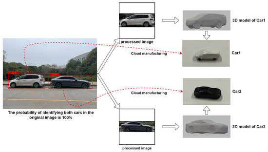 Similarly, the Picture2 is input into the YOLOv4 network, and the output results are shown in Table 3. Since two cars were detected in the original picture, two new car pictures are generated. The resolutions of the new pictures are and respectively. The new images are fed into the DVR network, which generates 3D models of the two cars. The 3D models are imported into the DF3 printer to produce two small cars. The manufacturing process of the two cars is shown in Figure 5.