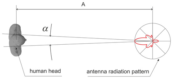 In our research, we focus on modeling the interaction of electromagnetic waves and the human body. Based on the distribution of power density in the head area obtained from the Maxwell equations-based numerical method (FDTD), we create a new model, which is a trained neural network. These studies require a lot of input data, such as FDTD simulation results. In order to carry out our research, we had to make simplifying assumptions. In further research, we do not consider all variants of body exposure to electromagnetic waves but only those that we consider important for the potential application of the model, i.e., quick verification of people exposition to radiation from base stations. The radiation from a terminal to the user head is not covered in our work because it would require the analysis of the radiation from its antenna. In this case, the head is very close to the terminal (in the so-called near field) and affects the parameters of the antenna. To model this phenomenon, we would have to use the numerical model of the terminal antenna as the wave source. Since there are some design differences between terminals and their antennas, our research would be difficult to generalize. The second reason is that the antennas of 5G terminals have dynamically controlled radiation pattern, and therefore it would be necessary to analyze many cases with different radiation characteristics of such an antenna. Our research assumption, which we adopted consciously, is the exposure of the body to radiation from the distant base station and free space propagation of the electromagnetic wave. In this case, we neglect the wave components reflected from obstacles and the ground. The source of energy is the main beam formed by the directional antenna of the base station, as presented in Figure 2. In the considered case that refers to a typical scenario of mobile telecommunication system, the human head is very far from the base station. The A parameter in Figure 2 could be equal to 50 m, in the case of a person rather close to the base station. Being the width of the head approximately 0.2 m, the α angle in Figure 2 is 0.2°. Hence, we can assume that the antenna gain is the same for the whole head. Because the antenna is far from the head, we can treat it as a point source, which produces a plane wave of constant power density for the entire angle that covers head. This is a standard approach in analysis and design of mobile communication systems.