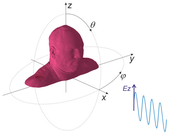 The field analyses were carried out in order to obtain the power density distribution due to the exposure to a vertically polarized electromagnetic wave at 3.5 GHz frequency, which is typical of 5G wireless telecommunication systems. As presented in Figure 3, the direction of wave incidence was controlled by mean of 2 angles: θ in vertical (z-x) and φ in horizontal (x-y) plane. The amplitude of incident wave was constant, and the absolute value of electric field component was equal to 10 V/m.