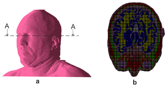 In our research, we have utilized the FDTD method and heterogeneous model of the human head to obtain data for network training. Specifically, Remcom XFdtd version 7.9 software [12] along with a body model exhibiting 1 mm voxel size was applied. Specifically, the used model of the head consists of 25 tissues with electric properties characterized by Cole–Cole parameters [13]. This a model that was made using information from body scans obtained from the magnetic resonance technique at the Hershey Institute [14,15].