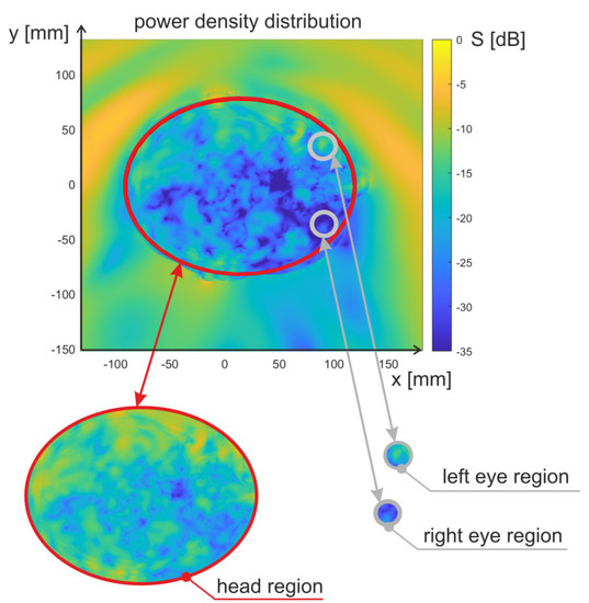 The head region and eye regions indicated in the power density distribution obtained from FDTD simulations.