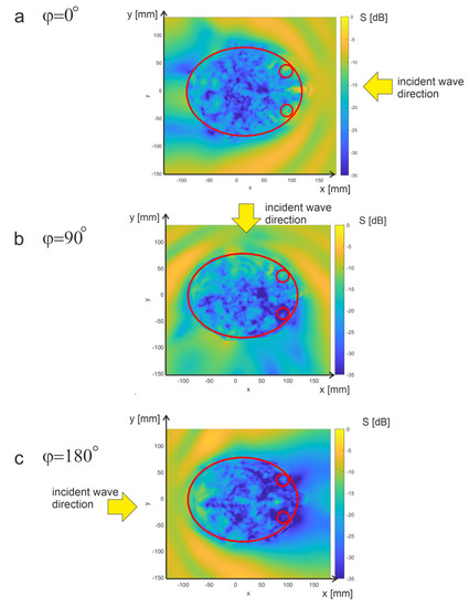 The power density distribution at different points in the head area depends to a large extent on the direction of the incident wave. Figure 6 presents exemplary results obtained for exposure of the head to a wave emitted from various directions. The results are shown for a wave propagating in the horizontal plane (x-y) for which θ = 90°. The simulation results are presented in the cases of a wave propagating from the front of the head, side, and back, respectively. For each of these cases, there are different sub-regions in which the maximum values of the power density occur. For an exposure with an φ angle of 0°, the maximum is at the front, while for an exposure with an φ = 90°, the maximum is on the left side of the head. In the case of exposure to the propagating wave from the side of the head vein (φ = 180°), there is an area with a maximum value in the posterior part.
