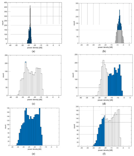 Similar dependencies also occur for maximum values. For the whole head area, the distribution is concentrated around the most common value of −8 dB, but compared to the distribution of average values for this area, the variance is higher. The distributions of the maximum values for the eyes are less concentrated, similar to the mean values. For the left eye, the most common value is −21.5 dB, but values −22 to −8 dB are characterized by high occurrence. For the right eye, the most common peak is −8.5 dB, and values from −25 to −8 dB are common in the results.