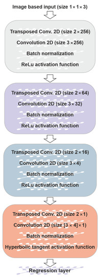 Moreover, the transposed convolutional layers are characterized by filters of size 2 × 2. The number of filters vary from 256 to 1. The convolutional layers are characterized by filters of size 3 × 3 (the first three blocks) and 3 × 4, the last one. The number of filters varies from 256 to 1, depending on the block. The convolutional layers have stride equal to 1 and padding set as “same”, which means that the dimensions of the input and the output of the layer are the same. In turn, the transposed convolutional layer allows the enlargement of the dimension of the image because the output of the layer is larger than the input. Hence, from the beginning to the end of the CNN, the image is enlarged, and the filters decrease from 256 to 1.