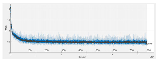 The Root Mean Square Error (RMSE), i.e., the standard deviation of the residuals (prediction errors) versus the iterations, is shown in Figure 9.