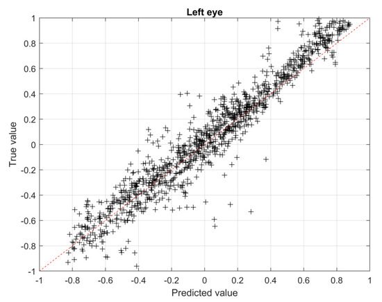 The true vs predicted value plane is a graphical way to represent the accuracy of the prediction: the closer the points to the diagonal, the more accurate the solution. In particular, the normalized solutions obtained with the CNN are reported in the plane (see Figure 10, Figure 11 and Figure 12). In particular, in Figure 10 the results for the left eye are shown, while, in Figure 11 and Figure 12, the results for the head are shown, making a distinction between average values (Figure 11) and maximum values (Figure 12), respectively.