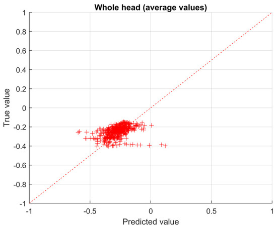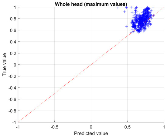 The RMSE calculated according to Equation (6), with reference to the validation set, for the left eye region (see Figure 10) is 0.12, for the whole head region, average values, is 0.057 (see Figure 11) and for the whole head region, maximum values, is 0.087 (see Figure 12).