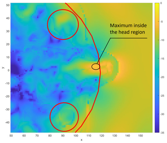 The results of power density distribution (dB) obtained for exposure to a wave coming from the direction of φ = 0°, θ = 90°. x and y dimensions given in mm. The eyes are highlighted with red circles.