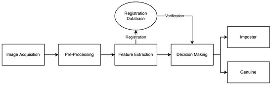 Once the preprocessed image is obtained, the next stage in the system is feature extraction and finally decision making or matching. Feature extraction is the process of capturing important features from the input image. The majority of the literature surrounding feature extraction in wrist vein recognition utilise texture feature extraction methods, which include statistical, structural, transform-based, model-based, graph-based, learning-based and entropy-based approaches [28]. Image recognition is the process of classifying a set of features to determine if they match the known stored features, giving a genuine match or imposter. In more recent years, neural network-based approaches have seen a larger interest in palm vein biometrics; however, research is still limited in terms of wrist vein.