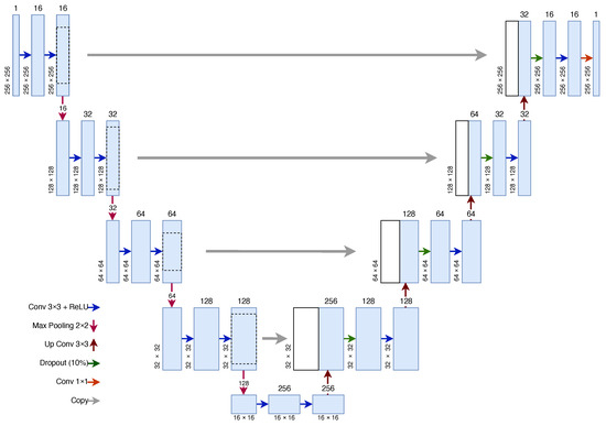 The contracting path consists of four contracting blocks, each of which contains two 2D convolutions with a 3 × 3 kernel. The number of features doubles in every contracting block. The ReLU activation function is used with the 2D convolutions. These convolutions are followed by max pooling with a 2 × 2 pool size to downsample the feature map, which doubles the number of filters and halves both dimensions of the image. In this U-Net implementation, the input image contains one filter layer which is increased to 16 in the first contracting block. The number of filters then doubles every contracting block up to 128 filters in the final block.