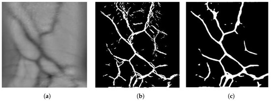 To generate labelled data for training the U-Net, a mask image generation algorithm was used as proposed in our previous work in [32]. The image is first denoised by applying a non-local means denoising algorithm and performing opening, which is the process of eroding away the edges of pixel groups and then dilating the remaining pixels with the aim of removing noise. Histogram equalisation is then performed to improve the contrast between vein and skin. An iterative process of erosion and dilation is then performed until no more pixels are removed. A vein pattern image from the FYO database, its generated mask image and the output of the U-Net segmentation algorithm for wrist are shown in Figure 4.