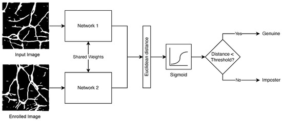 Siamese Neural Networks are networks that consist of two or more sub-networks and have seen success for vein biometrics in [10]. Siamese networks have the ability to train using 1 or few samples and perform image matching with reasonable accuracy when compared with CNN. A Siamese Neural Network that utilises two identical sub-networks, each of which is provided with one wrist vein binary mask image as created by the U-Net and processes the same, is proposed in this article based on observations from [10]. The high-level network architecture is shown in Figure 6. Two binary mask images are presented to the network—one representing the input image and one representing an enrolled image. Both binary images are processed via two identical neural networks that share the same weights, which produce feature vectors. The Euclidean distance between the two pairs is then calculated and is fed into a sigmoid activation function. If the output of the sigmoid activation function is greater than a preset threshold, the two input images are considered a match.
