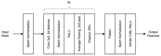 Figure 6 uses a sub-network. The architecture of this sub-network that processes each input image is shown in Figure 7. The network takes a binary mask image as an input and produces a vector of length 128, which represents the vein features in the binary mask image. The network consists of three convolutional blocks and a fully connected block. Each convolutional block consists of a 2D convolution layer with a 3 × 3 kernel producing 64 filter layers and is used to extract the features from the image. This is followed by a batch normalisation layer which smoothes the training of the network to increase the speed and stability of training [33]. A batch normalisation layer is also inserted at the very beginning of the network. A ReLU activation function is placed after the batch normalisation layer, followed by an average pooling layer with a 2 × 2 pool size to downsample the feature maps and finally a dropout layer to prevent overfitting of the network.