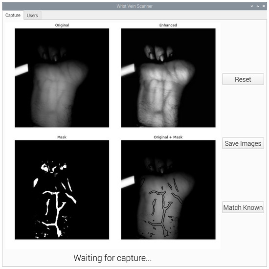 A graphical user interface (GUI) was developed to allow users to capture wrist vein images, segment them using U-Net and compare them using various matching networks. As the camera in use is the Raspberry Pi NoIR camera, the application needed to run on the Raspberry Pi itself. Python was chosen as the language of choice due to the machine learning algorithms also being developed in Python. PyQt5, a Python interface to the Qt GUI library, was used to design the application.