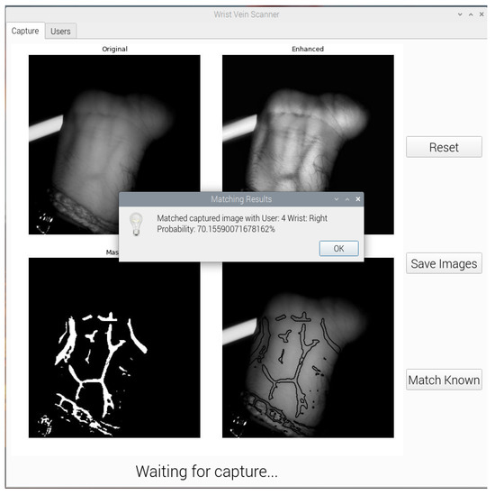 Due to the Raspberry Pi having significantly less computation resources as compared to a desktop computer, it is not possible to install and run TensorFlow 2 without significant work-arounds. TensorFlow Lite (TFLite) is a lightweight version of TensorFlow that has the ability to run inference on small embedded platforms such as Raspberry Pi. Regular TensorFlow models can be compiled into a TensorFlow Lite model. The GUI application uses a TFLite U-Net model to segment the wrist vein images. To support the future development of matching networks, the application can also load different TFLite models from a folder to use in the matching process. The CNN and siamese neural network models are pre-loaded into the initial setup. The segmentation and matching processes of the GUI are shown in Figure 8 and Figure 9, respectively.