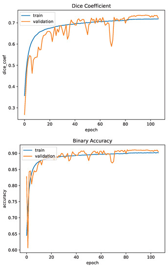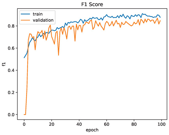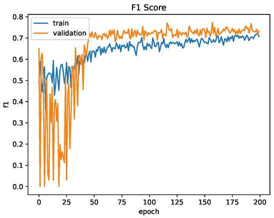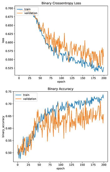 The CNN was trained for 200 epochs. The binary cross entropy loss function was used for training and validation. Binary accuracy and F1-score were used as the accuracy metrics. The network achieved a binary accuracy of 65.6% and an F1-score of 73.3% after training for 200 epochs. Figure 12 and Figure 13 show the evaluation metrics of the network for the training and validation datasets for one training session.