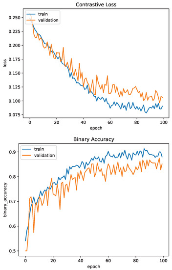 The Siamese Neural Network was trained for 100 epochs. Contrastive loss was used for training and validation. Similar to the CNN, binary accuracy and F1-score were used as the accuracy metrics. The network achieved a binary accuracy of 85.1% and an F1-score of 84.7% after training for 100 epochs. Figure 14 and Figure 15 show the contrastive loss, binary accuracy and F1-score of the network for the training and validation datasets for one training session.
