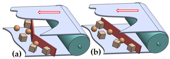 Additional equipment for conveyor belts also includes so-called belt cleaners. The purpose of primary belt scrapers [12] or secondary belt scrapers [13] consisting of a blade or rotary brush belt cleaners [14] is to wipe the remaining grains of the transported material off from the working surface of the conveyor belt. Material grains that fall over the edges of the conveyor belt’s working surface and fall on the surface of the return branch (see Figure 1) are removed from the return branch of the conveyor belt using belt cleaners, either V-plough belt cleaners [15] or diagonal belt cleaners [16,17].
