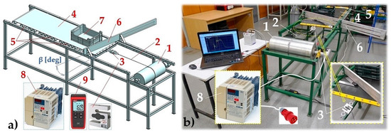 The laboratory testing device consists of a steel structure to which a drive drum is mechanically fixed 1. The drive drum 1, marked by its producer as LAT216.1 [22] (with technical parameters nb = 32 min−1, M2 = 441 N·m, Fb = 4090 N), was purchased from the company Bluetech s.r.o., Pacov, Czech Republic. This drum with a diameter of Db = 216 mm is made of steel, and rotated at a peripheral speed of vb = 0.37 m·s−1 in bearings pressed on a shaft with a diameter of 40 mm. The drive drum, with a built-in planetary gearbox (a gear ratio ip = 29.06), uses a three-phase electric motor with the power of Pe = 1.5 kW and nominal speed ne = 930·min−1.