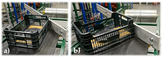 In the second phase, the piece load on the conveyor belt is rotated until the moment when the entire front surface of the piece load is aligned with the surface of the scraper plough, see Figure 3b. When the conveyor belt moves, a resistive force FM2(i) − FM1(i) [N] (the resistance of the material scraping plough) is generated, which can theoretically be expressed as a frictional force Tb [N], see (4), where f [-] is the coefficient of shear friction during movement on the contact surface of the load and the surface of the conveyor belt.
