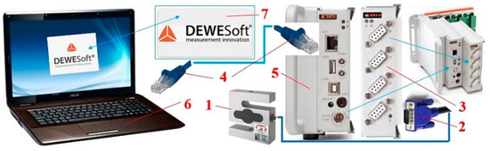 Measuring chain for the experimental measurement of conveyor belt tensile force: 1—load sensor; 2—D-sub plug; 3—measuring module BR4D of the strain gauge apparatus DS NET; 4—network cable; 5—gateway module DS GATE; 6—laptop; 7—software DEWESoft X2 SP5.