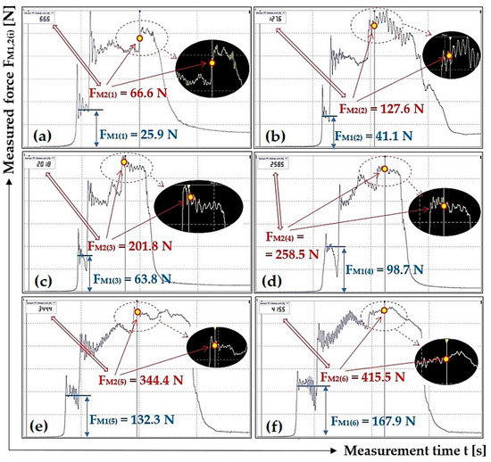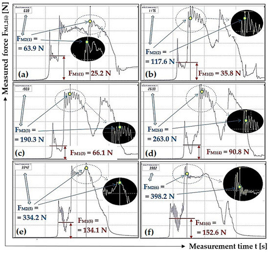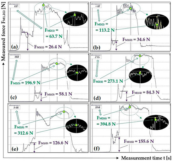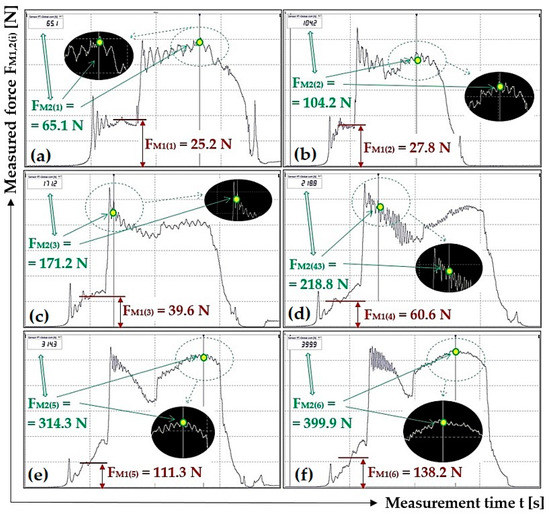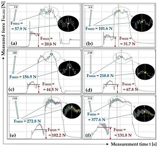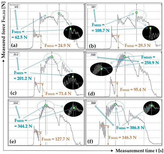 Figure 11 presents one of the ten measurements recorded using DEWESoft X2 SP5 software, from which the magnitude of the tensile force FM1(i) [N] was determined, as listed in Table 1. None of the time recordings of the measured tensile forces FM1(i) [N] obtained with the help of the laboratory device and DEWESoft X2 SP5 software are documented in this paper. (All i = 10 records are available to interested parties upon request from the authors of the article).