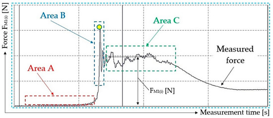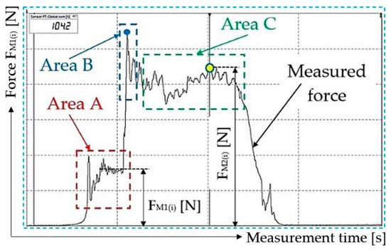 A part of the time curve for the measured force recording shown in Figure 12 is divided using dashed lines into three areas.