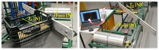 The measuring chain applied to the experimental measurements of tensile forces FM1(i) [N] and FM2(i) [N] when the load is ploughed from the conveyor belt travelling with a constant speed vs. [m·s−1] on the surface of which the load is carried away, is displayed in Figure 4.