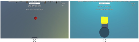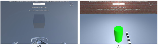 We assessed the egocentric distance estimation skills of these participants at ten various distances in the range [25 cm, 160 cm] at 15 cm intervals. The order of these distances was randomized, and each one had to be estimated twice. Firstly, all distances had to be estimated without a scale on the ground. After every distance was estimated, then the scale appeared for the same 10 distances, but also in a randomized order. The scale contained 17 cubes , starting from the observer. Information about the measurements was given to each participant before the procedure started: they were briefed about the process and how to enter their estimates, the dimensions of the room, and the scale. They were not informed about the investigated distances and the 15 cm step between them. They were only told that the distance would never be zero. After acknowledging the information, they could start the application. Then, participants had to input the following data either with a keyboard or the touchpad on the Gear VR: their age, gender, height, handedness, average gaming hours per week, whether they have glasses, and whether they have VR experience. After all information was entered, the start button became clickable. By clicking on it, the participant was placed inside the VE, right at its center. The most important datum was the height of the participant, as the virtual camera was placed at the same height in the VE. The room was 12 m wide on both axes. Thus, the distance to the walls was 6 m in every direction. It did not change during the measurements. Examples of this VE with various compositions are shown in Figure 1.