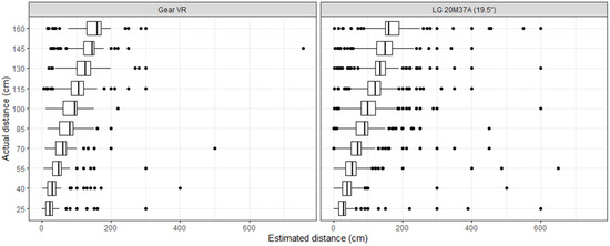 When the actual distances were compared to estimates in the PC version, each of them was overestimated, although not all were significant. In the range [40 cm, 160 cm], the overestimates were smaller than 10%. Those that were significant could be observed at 130 cm () and 160 cm (). In the VR version, underestimates were observed at all distances except for 25 cm. Although significant, it was an overestimation. The results for VR follow: 25 cm (), 40 cm (), 55 cm (), 70 cm (), 85 cm (), 100 cm (), 115 cm (), and 130 cm (). No significant differences were found at 145 and 160 cm. Afterward, the same distances were compared on both platforms. The two smallest (but still significant) differences were at 145 cm () and 160 cm (). The differences are strongly significant for the remaining distances ().