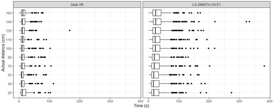 Similar to the previous examination, only one significant difference could be found in the PC version. However, it was at 160 cm (). All distances were accurate or overestimated. In the case of the VR version, significant differences could be observed in the range [25 cm, 130 cm] () and at 160 cm (). All distances were underestimated on VR. When the estimates were compared between the two versions, significant differences could be found in the range [25 cm, 115 cm] () and at 160 (). Except for 25 cm, the use of the Gear VR significantly decreased estimation times by 47.34%, on average, at the other distances ().