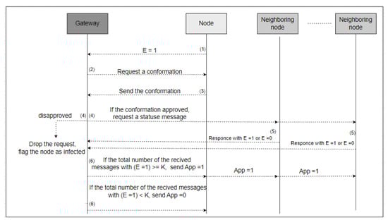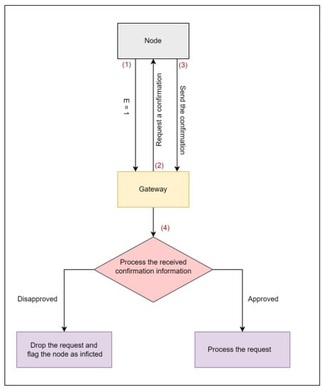 The silence period is a method used to protect the identity information of the node once the temporary DID is about to expire. It is a time period during which the node does not participate in any activity. During the silence period, the node will change its DID to prevent linkability. Once the DID is about to expire, the source node, N, must notify the gateway by sending a message that has an expiration status (E = 1). A message with E = 1 means the DID is about to expire, and the node needs approval to change it. Once the gateway receives the message with E = 1, it will request a confirmation from node N, which is the identity of the first gateway the node registered with and the timestamp. Thus, if the confirmation information matches the information in the registration table, the gateway will process the node request. Otherwise, the request will be dropped, and the gateway will flag the node as infected. Figure 5 explains the confirmation process, and Figure 6 illustrates the DID change message exchange between nodes and gateway.