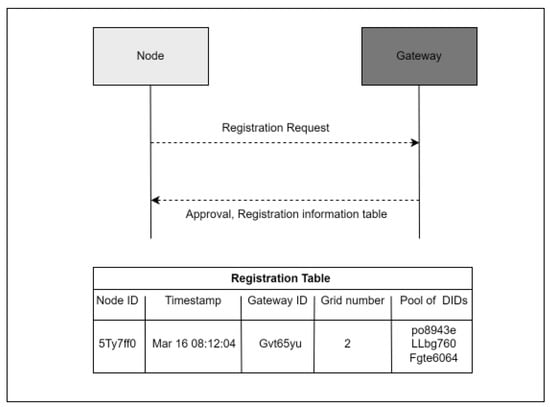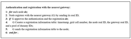 Figure 2 demonstrates the second step; each node is initially required to authenticate itself and register with the nearest gateway G by sending its real ID. Once the registration is approved, the registration information table for each node will be created. The registration information contains the timestamp, the grid cell number, the ID for the node, the ID for the gateway, and a pool of dummy IDs. Then, the gateway will transmit the registration table to the node. Figure 3 shows the algorithm for the authentication and registration step.