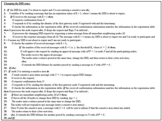 The DIDs will be used for any communication in the field in place of the real IDs. By using DIDs, the real identity will be protected. However, if the node changes its temporary DID during its cyber-activity, the information could be linked to track the target node. Thus, we propose using a silence period concept to protect the identity information while changing the temporary DID. The changing of the DID must occur under two circumstances as explained below. Figure 4 illustrates the formal algorithm for changing the DID.