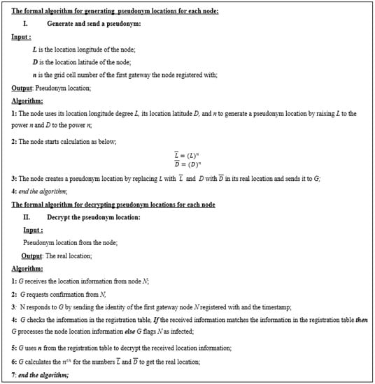 To consider the privacy of the location information, another security layer is proposed in this paper, as shown in Figure 7. Consider a node with longitude L and latitude D. Assume that n is the grid cell number of the first gateway the node registered with. To generate a pseudonym location for this node, we propose changing L and D to and , respectively, as shown in Equations (2) and (3).