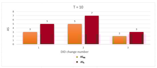- Average anonymity of the source node per DID change (Average AS): In our simulation, to measure the further enhancement introduced by applying the sensitive area concept, we measured Average AS for the source node per DID change in two cases: when a sensitive area concept was applied, , and when a sensitive area concept was not applied, . Figure 8, Figure 9 and Figure 10 show and results with 10, 20, and 30 nodes in the network, respectively.