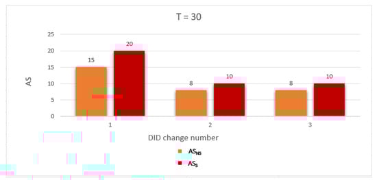 Figure 10. Anonymity of the source node (AS) for each DID change with 30 nodes.For results, since AS equals the number of NPN as we mentioned above, more participating nodes will increase the source node anonymity. For results, all the immediate neighboring nodes are forced to participate and change their DIDs whether their DIDs lifetime is about to expire or not. Thus, the number of nodes entering the silence period will be equal to or larger than the number of nodes entering the silence period in the case, which means AS for the source node is further enhanced.Table 4 shows the Average and Average per DID change. It is clear that applying the sensitive area concept further enhances the average anonymity of the source node for all different numbers of nodes in the network.