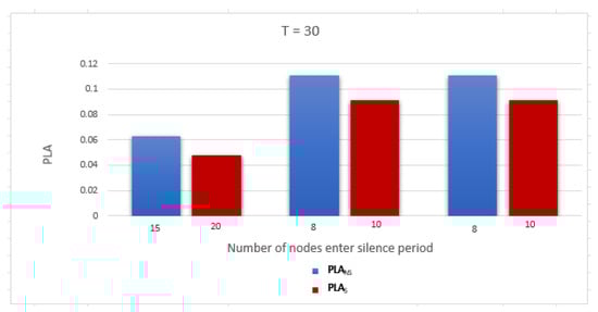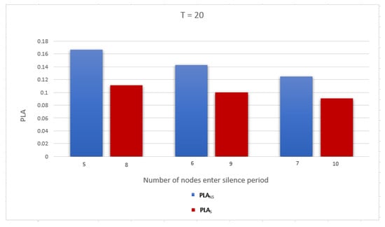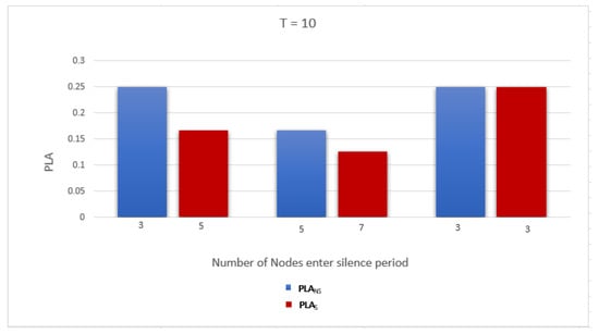 Table 4. Average anonymity (Average AS) of the source node per DID change. - PLA Figure 11, Figure 12 and Figure 13 present the PLA results for the total number of nodes T = 10, 20, and 30. It can be seen that in the case, increasing the number of nodes entering the silence period decreases the value of the corresponding . In addition, further enhancement is achieved in the case, since all immediate neighbors (M) of the source node are forced to enter the silence period and change their DIDs.