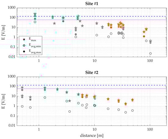 The three types of exposure levels obtained directly from the measurements (the extrapolated worst-case Emax, and the time-averaged Eavg,min and Eavg,max) are shown in Figure 3 for both sites as a function of distance to the base station.